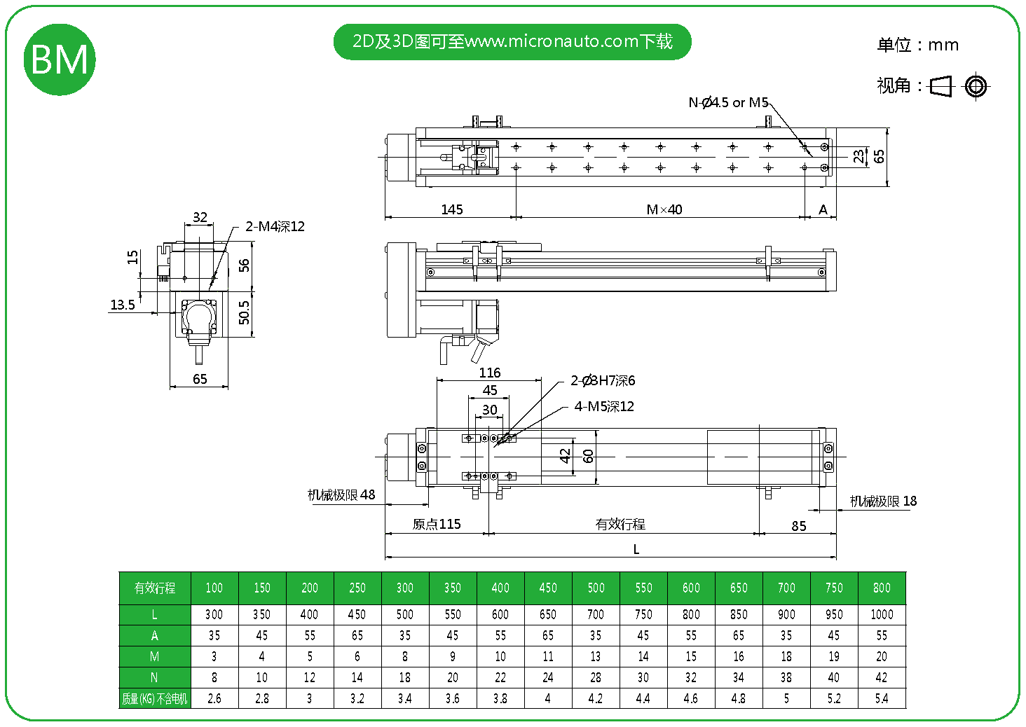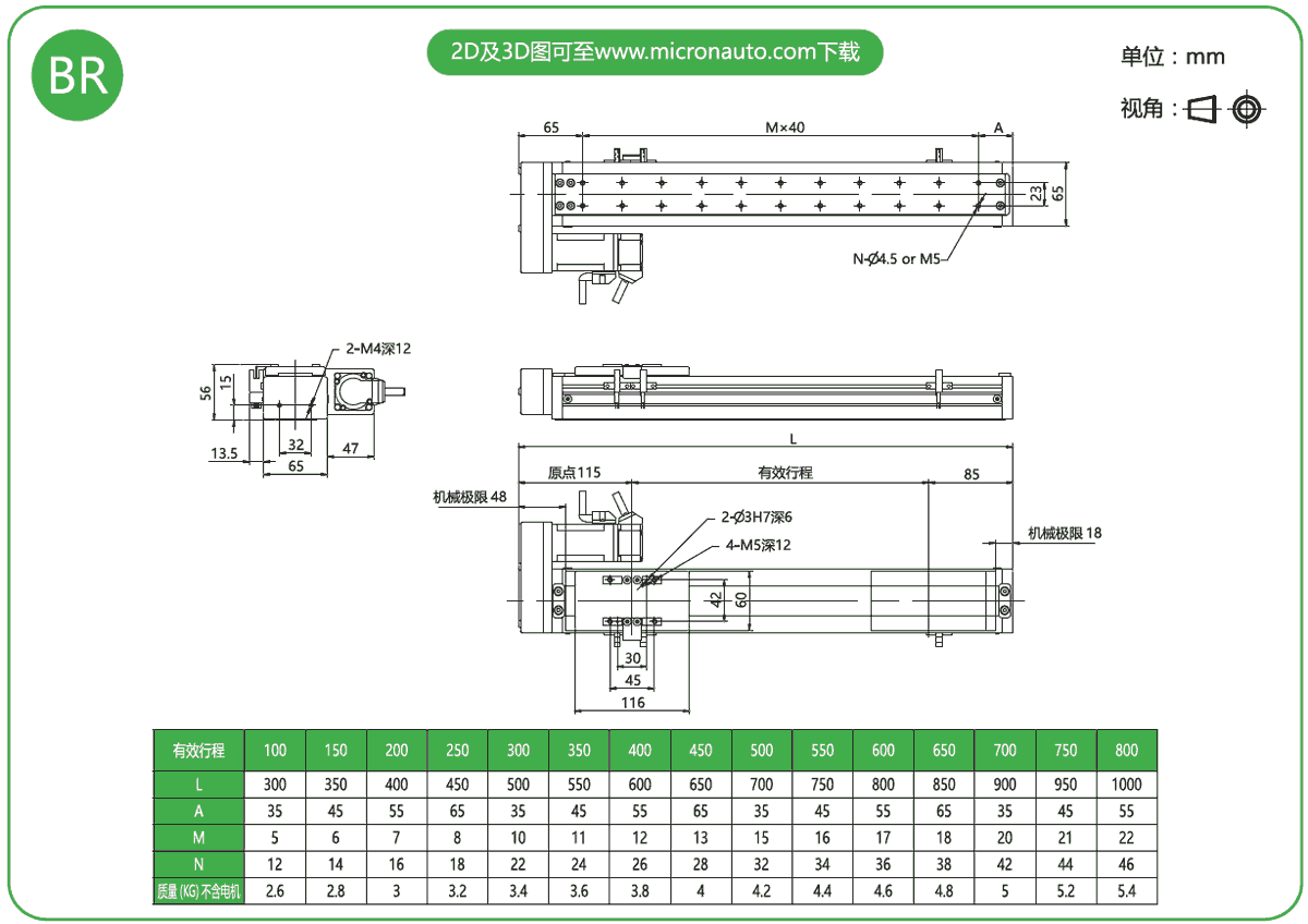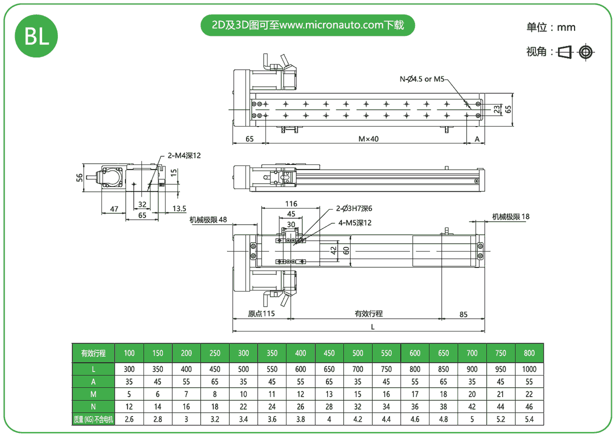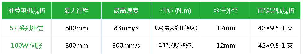 標準有效行程: 100~800mm(間隔50mm)