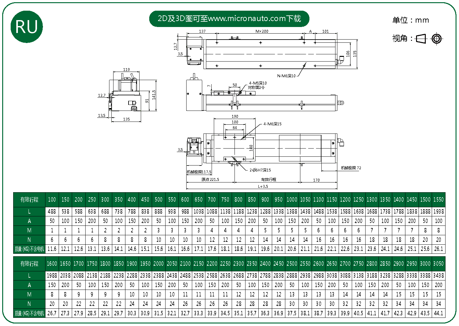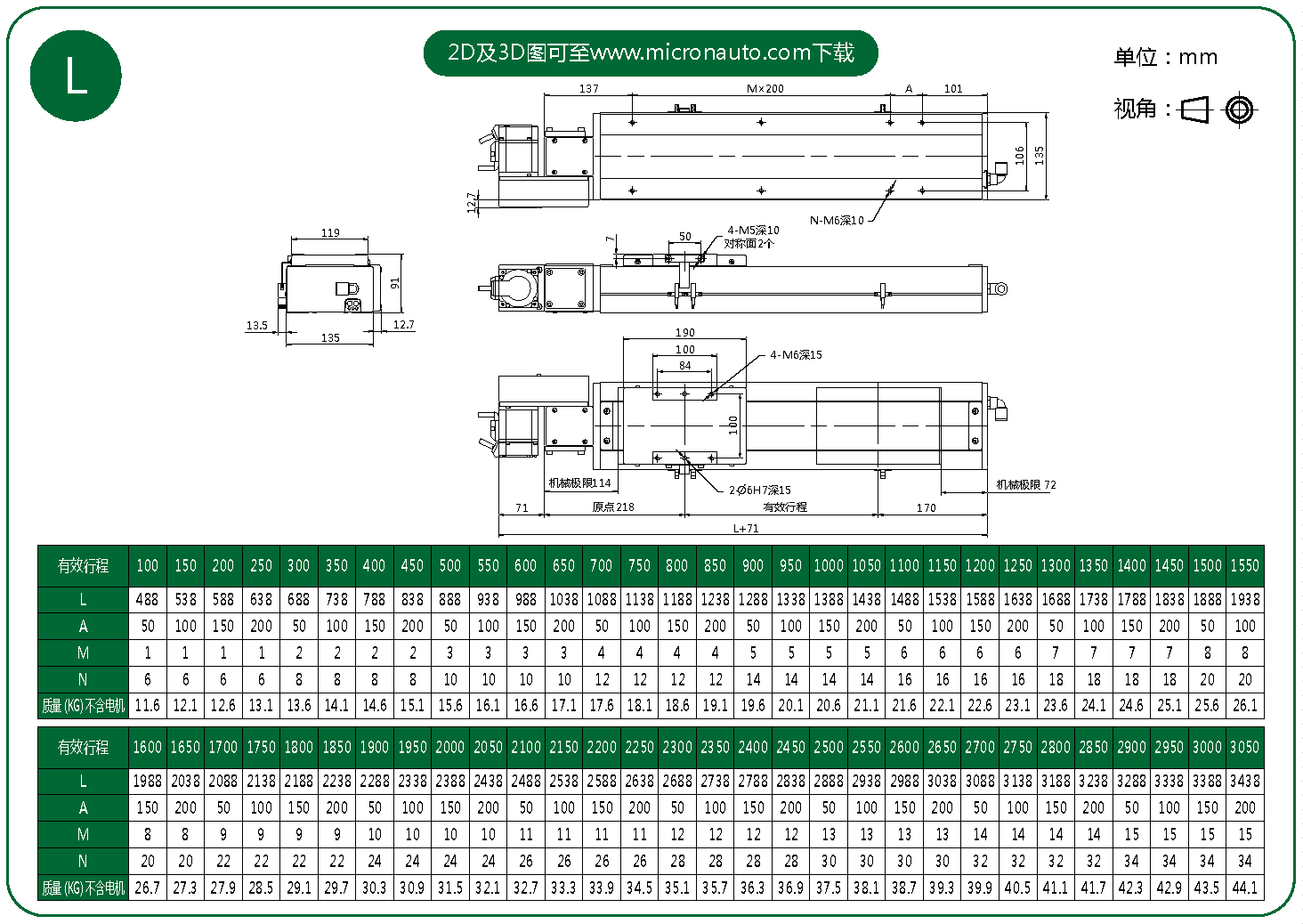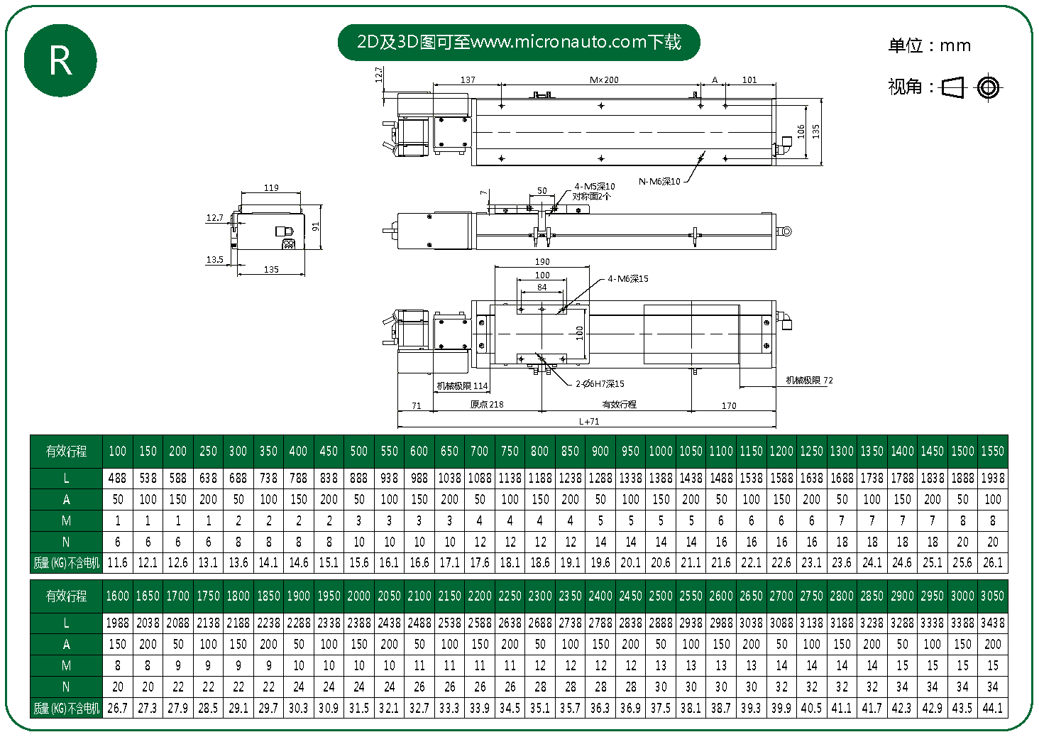 標準有效行程: 100~3050mm(間隔50mm)