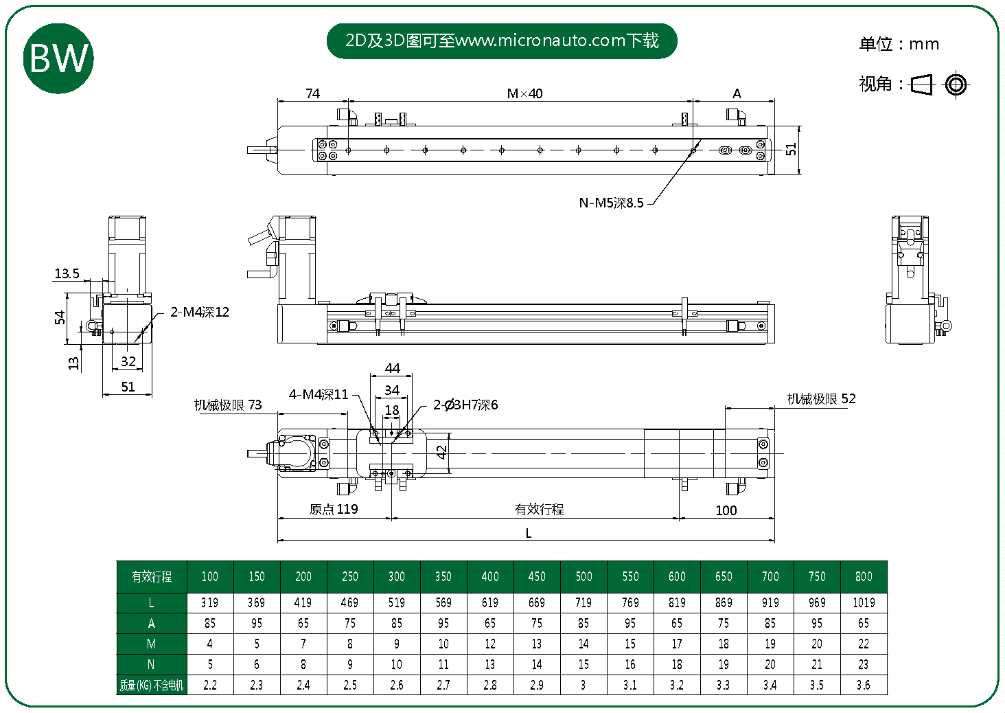 標(biāo)準(zhǔn)有效行程: 100~800mm(間隔50mm)